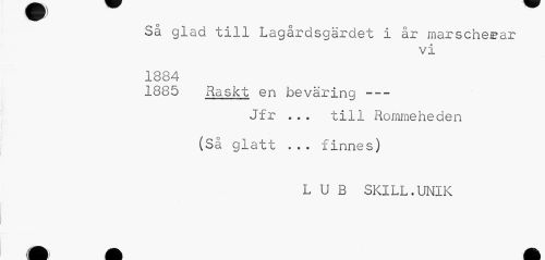 //// 1 w //// Så glad till Lagårdsgärdet i år marscherar //// vi //// 1884 188 //// ^ Raskt en beväring --- //// Jfr ... till Rommeheden //// (Så glatt ... finnes) //// L U B SKILL.UNIK ////
