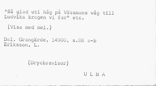 //// uSå glad uti håg pä Vässmans våg till Ludvika krogen vi far" etc. //// (Visa med mel.) //// Dal. Grangärde, 14900, s.88 a-b Eriksson, L. //// (Dryckesvisor) //// U L M A ////