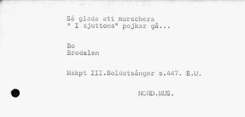 //// Sä glada att marschera " I sjuttons" pojkar gå... //// < //// Bo //// Brodalen //// Mskpt III.Soldatsånger s.447. E.U. 0 NORD.MUS. ////