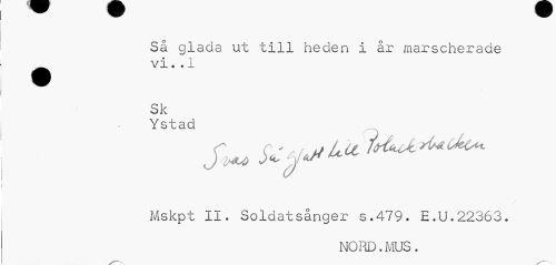 //// Så glada ut till heden i år marscherade ^ vi..1 //// Sk //// Ystad //// Sf* ^^^ //// Mskpt II. Soldatsånger s.479. E.U.22363. //// NORD.MUS. ////