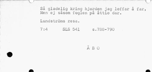 //// Så gladelig kring hjorden jag loffar å far, Men ej såsom foglen på åttio dar. //// Lundströms resa. //// 7:4 SLS 541 s.788-790 //// ÅBO ////
