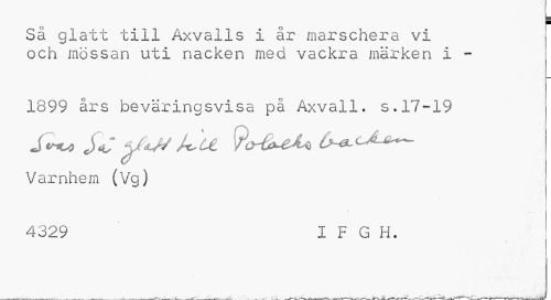 //// Sä glatt till Axvalls i år marschera vi och mo s s a n uti nacken med vackra märken i - //// 1899 års beväringsvisa på Axvall. s.17-19 Värnhem (Vg) //// 4329 IFGH. ////