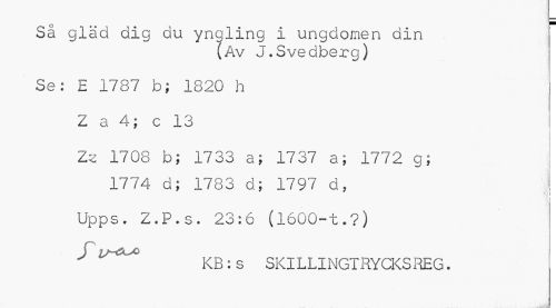 //// Så gläd dig du yngling i ungdomen din //// (Av J.Svedberg) //// Se: E 1787 b; 1820 h Z a 4; c 13 //// Zz 1708 b; 1733 a; 1737 a; 1772 g; 1774 d; 1783 d; 1797 d, //// Upps. Z.P.s. 23:6 (1600-t.?) ^ KB: s SKILLINGTRYCKSREG. //// j«-.i ////