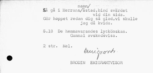 //// namn/ -... //// Så gå i Herrans/åstad,bind svärdet //// vid din sida. Gör hoppet redan dig så glad,vi skulle //// jag då kvida. //// S.18 De hemmavarandes lyckönskan. //// Gammal avskedsvisa. //// 2 str. Mel. ^ ^ ^ ^ ^ ^ BRODIN EMIGRANTVISOR ////