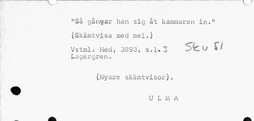//// / //// nSä gångar han sig åt kammaren in.u (Skämtvisa med mel.) //// Vstml. Hed, 3893? s.K 3 Sfc U f» //// Lagergren. //// (Nyare skämtvisor). ^ U L M A ////