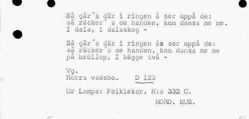 //// Så går'a där i ringen å ser uppå de: så räcker' a de handen, kom dansa me me. ^^ I dala, i dalaskog - //// Så går'a där i ringen ås ser uppå de: så räcker'a de handen, kom dansa me me på bröllop, I bägge två - //// Vg. //// Norra vaasbo. D 123 //// Ur Lampa: Folklekar, N:o 332 C. //// NORD. MUS. ////