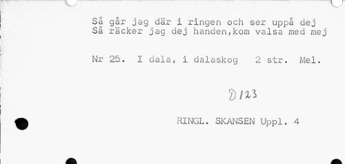 //// Så går jag där i ringen och ser uppå dej Så räcker jag dej handen,kom valsa med mej //// Nr 25. i dala, I dalaskog 2 str. Mel. A RINGL. SKANSEN Uppl. 4 ////