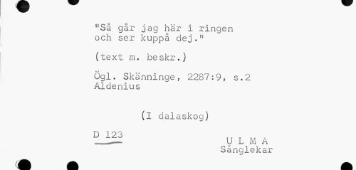 //// nSå går jag här i ringen och ser kuppå dej." //// (text m. be skr.) //// Ögl. Skänninge, 2287:9, s.2 Aldenius //// (i dalaskog) //// D 123 TT r T, ¦ //// u l m a //// Sånglekar //// /Hk ^^ //// \m B Ml É 11 ////