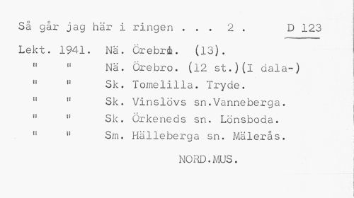 //// I //// Så går jag här i ringen . . . 2 . D 123 //// ^"mmmmmmrnmmmmmmmm //// Lekt. 1941. Nä. örebrå. (13). //// " " Nä. Örebro. (12 st.)(l dala-) 11 11 Sk. Tomelilla. Tryde. " 11 Sk. Vinslövs sn• Vanneberga. //// ö V //// fF " Sk. Orkeneds sn. Lönsboda. n 11 Sm. Hälleberga sn. Mälerås. //// i //// NORD.MUS. I ////