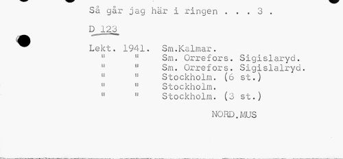 //// Sa gar jag här i ringen . . . 3 . D 123 //// ^^ Lekt. 1941. Sm.Kalmar. //// " 11 Sm. Orrefors. Sigislaryd. //// 11 " Sm. Orrefors. Sigislalryd. //// (l " Stockholm. (6 st.) //// " " Stockholm. //// " " Stockholm. (3 st.) //// NORD.MUS ////