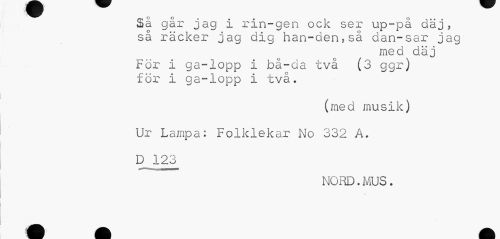 //// Sä går jag i rin-gen ock ser up-på däj, så räcker jag dig han-den,så dan-sar jag //// med däj //// För i ga-lopp i bä-da två (3 ggr) för i ga-lopp i två, //// (med musik) Ur Lampa: Folklekar No 332 A. D 123 //// NORD. MUS. ////