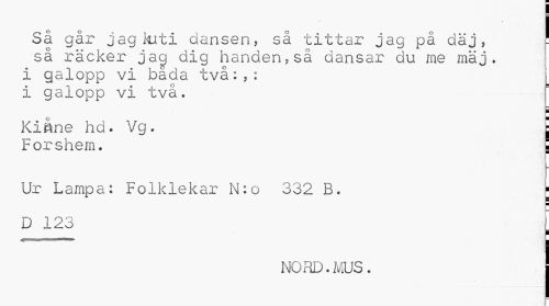 //// Så går jagkrti dansen, så tittar jag på däj , ! så räcker jag dig handen,så dansar du me mä j . //// i galopp vi båda två:,: i i galopp vi två. //// i //// Kiåne hd. Vg. c //// Forshem. j //// Ur Lampa: Folklekar N:o 332 B. ; //// D 123 I //// éfmmmmtmmmmrnmm L //// NORD.MUS. ////