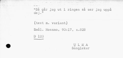 //// - • ... ... - .r .. ... — •-••-:. -c -t:. > ---— ---b „ ¦ •• //// . r ' i . //// •»!..•.V' //// f5Så går jag ut I ringen så ser jag uppå de j .n //// (text m. variant) //// Smål. Hossmo, 93:17, s.828 //// D 123 //// ^ Sånglekar ////