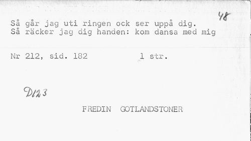 //// L/t //// Så gar jag uti ringen ock ser uppå dig. Så räcker jag dig handen: kom dansa med mig //// Nr 212, sid. 182 1 str. //// %% 3 //// FREDIN GOTLANDSTONER j ////