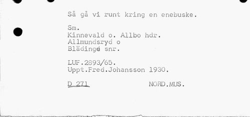 //// Så gå vi runt kring en enebuske. //// • Sm. //// Kinnevald o. Allbo här• Allmundsrya o Blädingé snr. //// LUF.2893/65. //// Uppt.Fred.Johansson 1930. H 971 NORD.MUS. ////