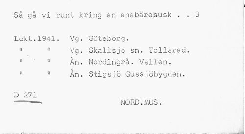 //// ¦ //// Så gå vi runt kring en enebärebusk . . 3 //// Lekt.1941. Vg. Göteborg. //// ff " Vg. Skallsjö sn. Tollared. //// I! ' u An. Nordingrå. Vallen. //// 11 f{ Ån. Stigsjö Gussjobygden. //// D 271 //// --* NORD.MUS. ////