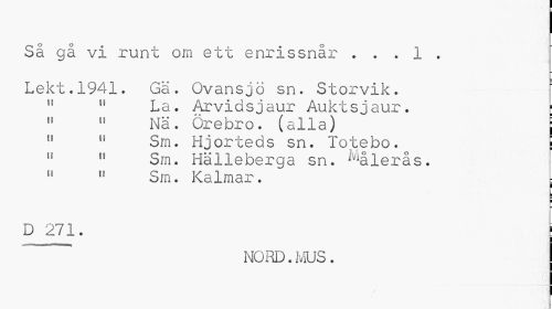 //// Så gå vi runt om ett enrissnår . . . 1 . //// Lekt.1941. Gä. Ovansjö sn. Storvik. //// H 11 La. Arvidsjaur Auktsjaur. j //// " n Nä. Örebro, (alla) ; //// " M Sm. Hjorteds sn. Totebo. i //// n " Sm. Hälleberga sn. iViålerås. //// " n Sm. Kalmar. = //// i //// i ¦ //// D 271. | //// "" NORD. MUS . ////