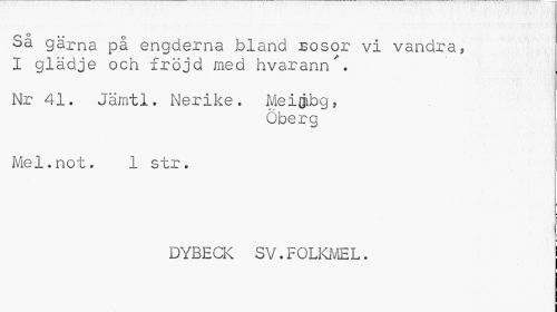 //// Så gäma på engderna bland sosor vi vandra, I glädje och fröjd med hvarann . //// Nr 41. Jämtl. Nerike. Meiflibg, //// Oberg //// Mel.not. 1 str. //// DYBECK SV.FOLKMEL. | ////