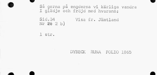 //// Så gerna på engderna vi kärliga vandra 1 glädje och fröjd med hvarann; //// Sid.34 Visa fr. Jämtland //// Nr 26 2 b) //// 1 str. //// DYBECK RUNA FOLIO 1865 ////