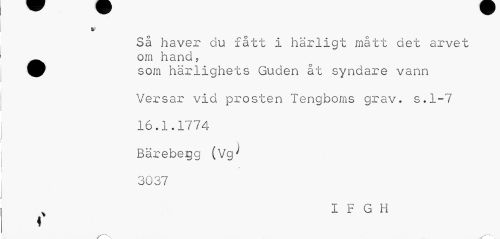 //// fr //// Sä haver du fått i härligt mått det arvet //// •om hand? //// y //// 1 som härlighets Guden åt syndare vann //// Versar vid prosten Tengboms grav. s.1-7 16.1.1774 Bärebejgg (Vg^ //// r //// 3037 //// I F G H //// \ //// s—x -- ////
