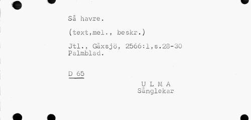 //// Så havre. //// (text ? mel.> be skr.) //// Jtl., Gåxsjö, 2566:1,s.28-30 Palmblad. //// D 65 //// U L M A Sånglekar ////
