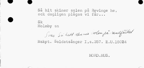 //// Så hit skiner solen på Revinge he. ock dagligen plågas vi får... //// Holrnby sn //// Mskpt. Soldatsånger I,s.357. E.U.180E4 //// NORD.MUS. //// t**—-v -x ////