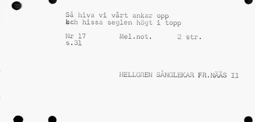//// Så hiva vi vårt ankar opp kch hissa seglen högt i topp //// Nr 17 Mel.not. 2 str. //// s.31 //// HELLGREN SÅNGLEKAR FR.NÄÄS II ////