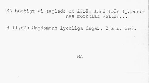 //// Så hurtigt vi seglade ut Ifrån land från fjärdarnas mörkblåa vatten... //// B 11,s75 Ungdomens lyckliga dagar. 3 str. ref. //// RA ////