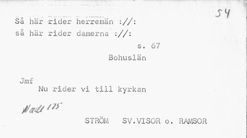 //// s y //// Sa här rider herremän ://: så här rider damerna ://: //// s. 67 Bohuslän //// Jmf //// Nu rider vi till kyrkan //// STRÖM SV.VISOR o. RAMSOR ////