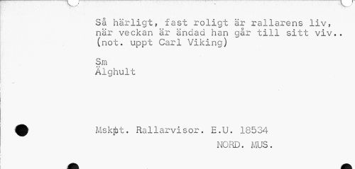 //// Så härligt, fast roligt är rallarens liv, när veckan är ändad han går till sitt viv.. (not. uppt Carl Viking) //// Sm //// » 6- //// Alghult //// ^ Mskfbt. Rallarvisor. E.U. 18534 //// nord. MUS. ////