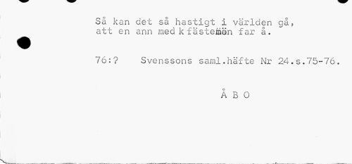 //// Så kan det så hastigt i väx^lden gå, att en ann med k fästemän far å. //// 76:? Svenssons saml.häfte Nr 24.s.75-76. //// ÅBO ////