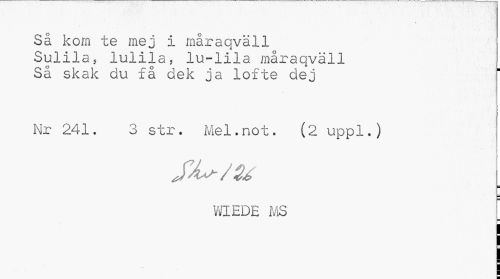 //// Så kom te mej i måraqväll Sulila5 lulila, lu-lila måraqväll Så skak du få dek ja löfte dej //// Nr 241. 3 str. Mel.not. (2 uppl.) //// WIEDE MS _ ////