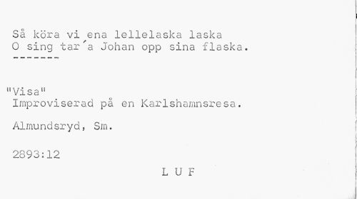 //// i //// Så köra vi ena lellelaska laska O sing tar'a Johan opp sina flaska. //// i //// "Visa" //// Improviserad på en Karlshamnsresa. //// I //// j //// Almundsryd, Sm. ! //// i i //// 2893:12 //// L U F ////