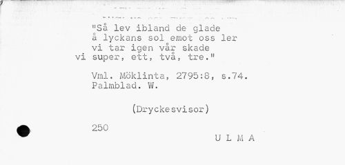 //// —•* •»• ¦ • -»,' -T-."- . , «• . • - • //// « t -t- ^—i --» •--- ,•—!.- , —•"--» //// nSå lev ibland de glade ä lyckans sol emot oss ler //// vi tar igen vår skade vi super, ett, två, tre." //// Vml. Möklinta, 2795:8, s.74. Palmblad. W. //// (Dryckesvisor) //// ® ' " " U L M A ////