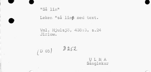 //// "Så lin" //// ^^ Leken "så linp med text. //// Vml. Hjulsjö, 438:3, s.24 //// Jirlow. ... . //// / D 65 / M * //// U L M A Sånglekar //// i //// ^""'X ...X ////