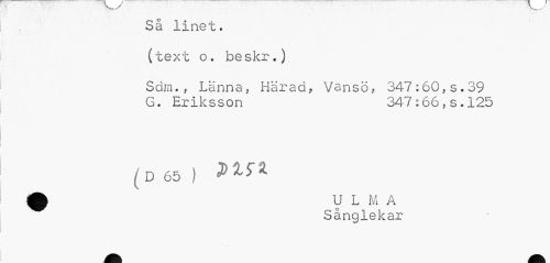 //// Så linet, (text o. be skr.) //// Sam.. Lanna, Härad, Vansö, 347:60,s.39 G. Eriksson 347:66,s.125 //// (D65 ) //// ^^ Sånglekar ////