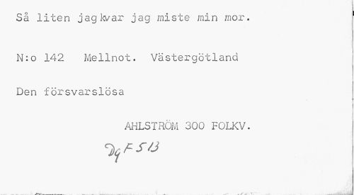 //// Så liten jag kvar jag miste min mor. //// N:o 142 Mellnot. Västergötland Den försvarslösa //// v //// AHLSTRÖM 300 FOLKV. //// If ^ SV //// . .. -w^rt. _.._.,. t f '. . ... , /ik . ////