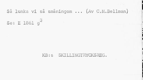 //// Så lunka vi så småningom ... (Av C.M.Bellman) //// 3 //// Se: E 1861 g //// ¦ //// I //// i ¦ //// i //// KB:s SKILLINGTRYCKSREG. 1 //// u //// I //// i ////