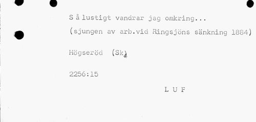 //// S ålustigt vandrar jag omkring... ^ (sjungen av arb.vid Ringsjöns sänkning 1884) //// Högseröd (Sk^ 2256:15 //// L U F ////