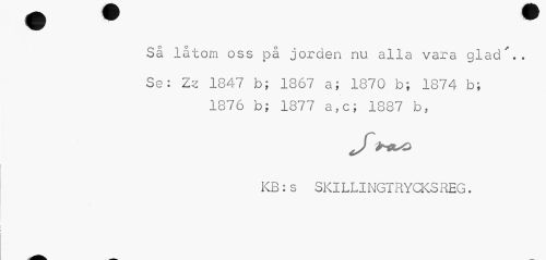 //// Så låtom oss på jorden nu alla vara glad'.. //// Se: Zz 1847 b; 1867 a; 1370 b; 1874 b; //// 1876 b; 1377 a,c; 1887 b, //// KB:s SKILLINGTRYCKS REG. ////