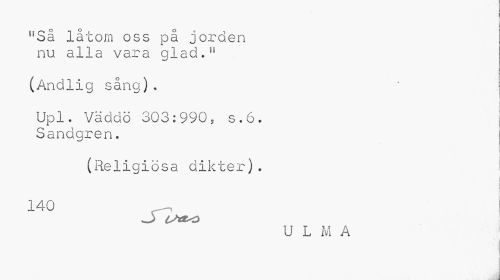 //// {fSå låtom oss på jorden nu alla vara glad." //// j //// (Andlig sång). ' | //// i //// j //// Upl. Väddö 303:990, s.6. j //// Sandgren. //// (Religiösa dikter). //// l //// 1 i //// 140 //// w> Utt^o //// U L M A //// i //// A ////