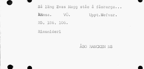 //// S m //// Så läng Evas Magg ståo å fåorarga... Rämsa. VO. Uppt.Wefvar. //// R5, 186, 106. //// Rimsnideri //// ÅBO RANCKEN MS ////