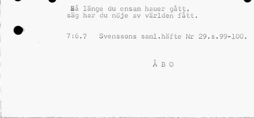 //// Bä länge du ensam hauer gått, säg har du nöje av världen fått. //// ^ 7:6.? Svenssons saml.häfte Nr 29.s.99-100. //// ÅBO ////
