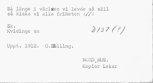 //// Sa länge i världen vi levde så säll så älska vi alla friheten ://: //// Kvidinge sn 2) /3 7 ( f J //// Uppt. 1912. G.Hfclling. //// r //// NORD MUS. //// ¦ //// Kopior Lekar //// ¦ ////