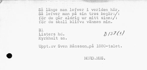 //// • •«•-•-- — *r " //// Sä länge man lefver i verlden här. Så lefver man på sin tros begär:/: för du går aldrig ur mitt sinn:/: för du skall blifva vännen min. //// Bl „ y //// Listers hd. J) /J ' c V //// Kyrkhult sn. //// Uppt.av Sven Månsson,på 1880-talet. ® NORD.MUS. ////