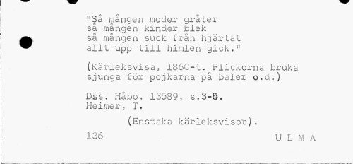 //// nSå mången moder gråter så mången kinder blek ^^ så mången suck från hjärtat //// ^^ allt upp till himlen gick.11 //// (Kärleksvisa, 1860-t. Flickorna bruka sjunga för pojkarna på baler o.d.) //// Dis. Håbo, 13589? s.3-9. Heimer, T. //// (Enstaka kärleksvisor). //// I36 U L M A ////