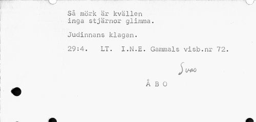//// Så mörk är kvällen inga stjärnor glimma. //// Judinnans klagan. //// 29:4. LT. I.N.E. Gammals visb.nr 72. //// J t HM //// ÅBO ////