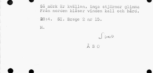 //// Så^mörk är kvällen, inga stjärnor glimma Från norden blåser vinden kall och hård. //// 28:4. SI. Brage 2 nr 15. //// N. //// J //// ÅBO ////