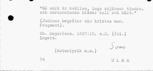 //// uSå mörk är kvällen, inga stjärnor tindra, och nordanvinden blåser kall och hård." //// ^ (Judinna begråter sin kristna man. //// Fragment). //// Vb. Degerfors, 1427:10, s.2. (fol.) Ingers. //// J) IM^O //// (Naturlyrik m.m.) 74 U L M A ////