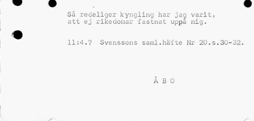 //// Så redeliger kyngling har jaa varit, att ej rikedomar fastnat uppa mig. //// 11:4.? Svenssons saml.häfte Nr 20.s.30-32. //// ÅBO ////